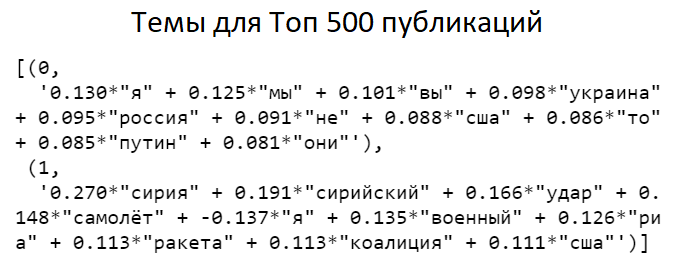 Темы для топовых публикаций более очерчены, можно выделить две основных: противостояние России и США на Украине и противостояние России и США в Сирии. При формировании тем большую роль играют местоимения «я», «мы», «вы», «они». Это говорит о субъективной окраске публикаций, о важности точки зрения автора.