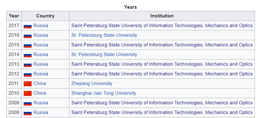 Теперь взглянем на место России, питерский университет ИТМО, он выиграл ACM 7 раз, и запад дал ему почетное 351 место, а питерский СПбГУ выиграл 4 раза и занял в рейтинге 401 место.