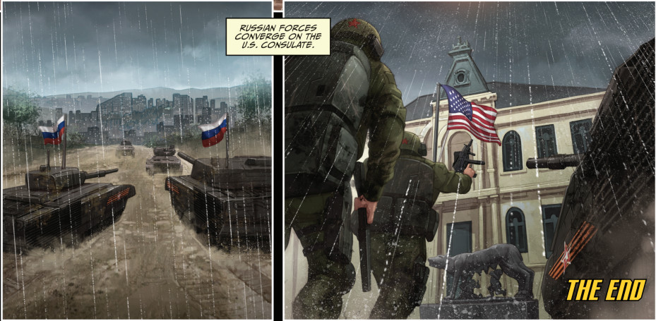История заканчивается началом военного конфликта, в котором российские войска сначала используют системы радиоэлектронной борьбы, выводя из строя беспилотные системы НАТО. Затем российская сторона нарушает работу системы связи и обмена данными. Дезорганизованные из-за отсутствия связи войска НАТО проигрывают войну, а российские силы приближаются к американскому консульству.