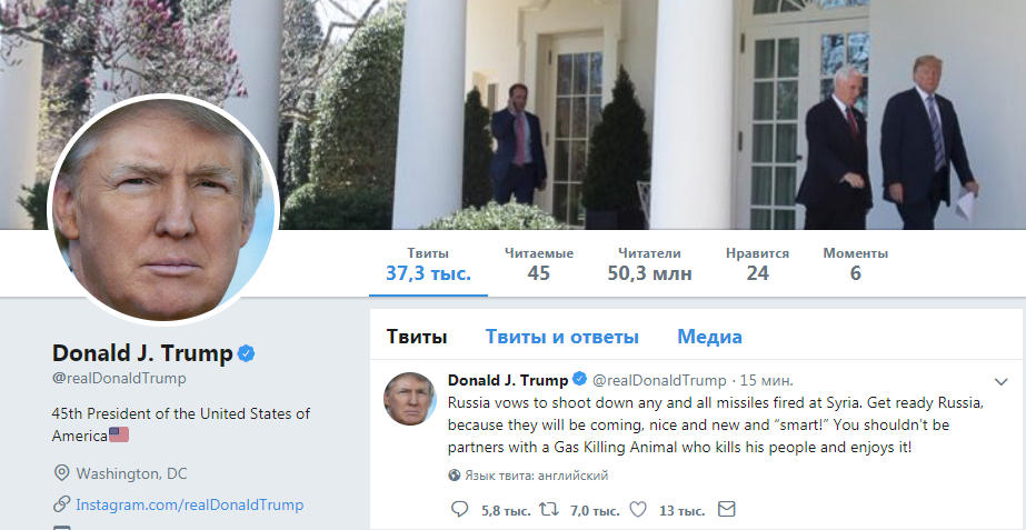 Перевод ведомостей: «Россия обещает сбить любые ракеты, выпущенные по Сирии. Готовься, Россия, потому что они будут. Хорошие, новые и "умные"! Тебе не стоило сотрудничать с Газовым Животным-Убийцей, который убивает свой народ и наслаждается этим!»