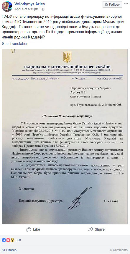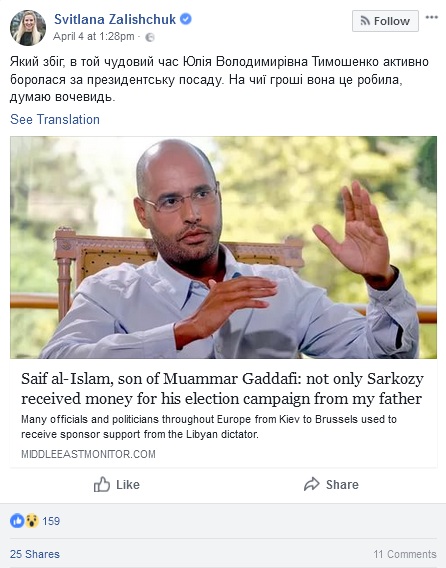 Депутаты от БПП развернули целую информационную кампанию по дискредитации основного оппонента Петра Алексеевича. Для начала нардеп Светлана Залищук на своей странице в Facebook выкладывает ссылку на интервью сына покойного ливийского диктатора, который поведал изданию middleeastmonitor.com о том, кто помимо Саркози "от Киева до Брюсселя" получал деньги на политическую деятельность.