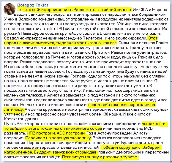 А так да - казахи не любят ни русских, ни таджико-узбеков. Скатились к националистическому государству уровня 19 века.