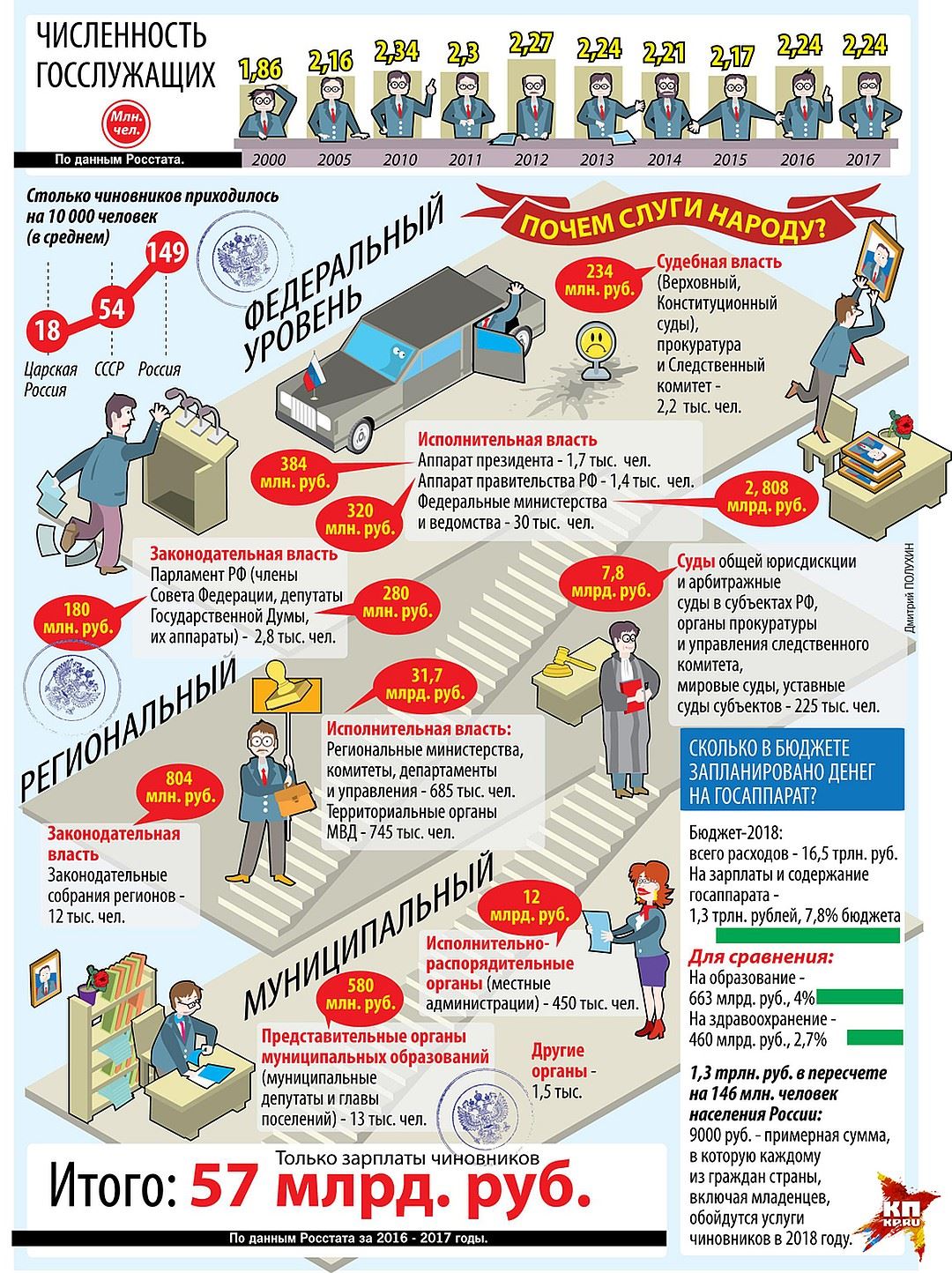 Изучать статистику весьма забавно. 18 лет назад без повсеместной компьютеризации, единых баз данных, электронного документооборота с обслуживанием страны справлялось меньше людей, чем сегодня. А зарплаты госслужащих тогда были заметно ниже, чем в коммерческом секторе. Если предложенный Кудриным план действительно будет реализован, то через шесть лет, как раз к новым президентским выборам, в России останется меньше 1,5 млн. чиновников. Сэкономленные на них деньги превысят годовой бюджет на здравоохранение.
