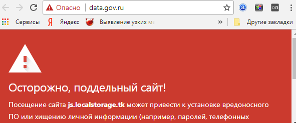 Каково же было мое удивление, когда браузер Хром выдал, что это фишинговая страница. Я проверил - действительно в заголовке страницы скрыто подключается скрипт со стороннего сайта https://js.localstorage.tk