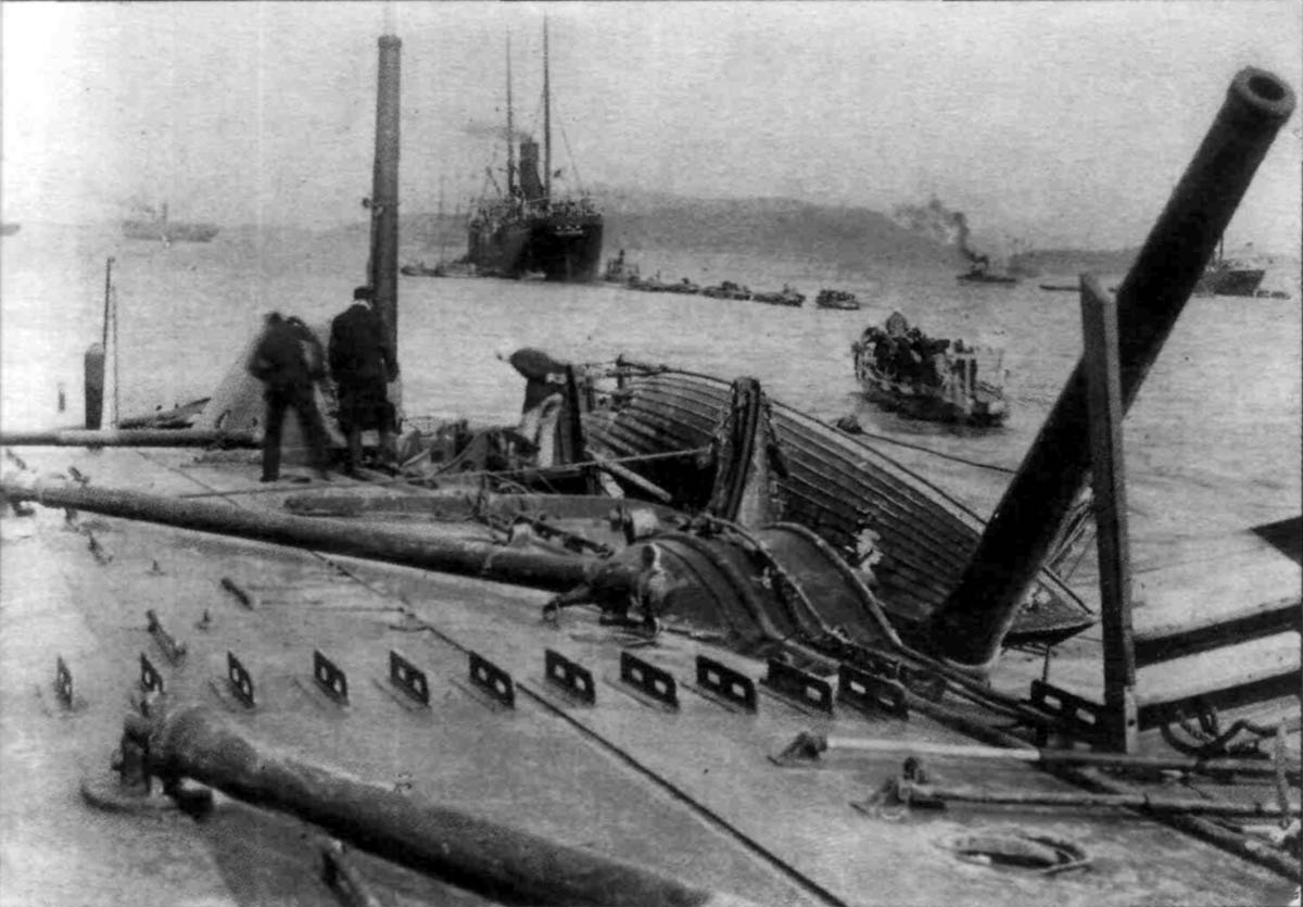 Повернув обратно и став под защиту наших батарей, эскадра начала разворачиваться, строясь в боевой порядок; в это время выходили на внешний рейд последние суда. Вдруг у носа "Петропавловска" показывается огромный столб воды, слышится мягкий звук взрыва мины, непосредственно за ним второй взрыв более интенсивный - вся средняя часть огромного броненосца объята пламенем и тучей желто-бурого дыма, корма поднялась кверху, винты беспомощно вертятся в воздухе и через 2 минуты броненосца не стало, на его месте плескались волны, да подоспевшие миноносцы и шлюпки спасали выгребавших в ледяной воде людей.