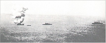 №1. Броненосец "Петропавловск" наскочил на мину, взорвался, опрокинулся. Наша эскадра под Золотой горой; японская приближается.