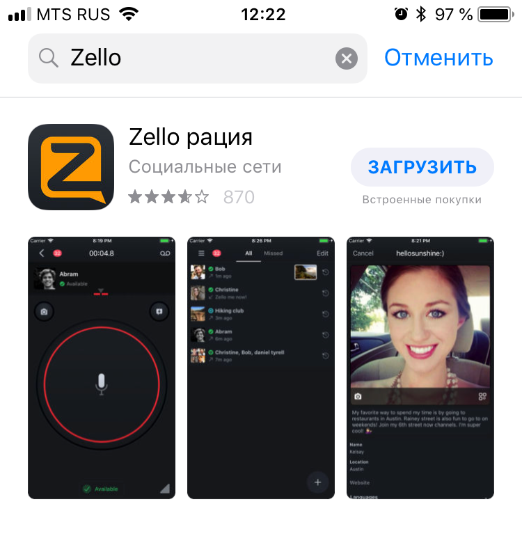 (на самом деле Zello доступно в App Store. — Прим. ред.)
