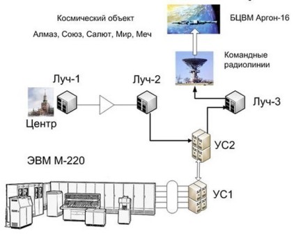 Проект, названный «УСЛ-2», предусматривал полное сохранение существующей системы с «врезкой» в неё устройств сопряжения, исключающих механические ограничения (перфоленты) при закладке на борт. Устройство УС-2 устанавливалось рядом с ЛУЧ-2 и ЛУЧ-3 в здании КРЛ. Второе устройство УС-1 — в машинном зале М-220. Информация, передаваемая из Центра на ЛУЧ-2, вводилась в УС-2 , передавалась на УС-1 и записывалась в оперативную память ЭВМ, где и сохранялась до очередного сеанса связи с бортом. Во время сеанса данные из оперативной памяти ЭВМ через УС-1, линию связи, УС-2, ЛУЧ-3 выдавались на КРЛ и на борт КО. Скорость работы такого комплекса обеспечивала закладку информации объёмом до 2 тыс. слов троекратно за время прохождения объекта (орбитальной станции) в зоне НИП (около 6 минут). Задача в рамках проекта «Алмаз» была решена.