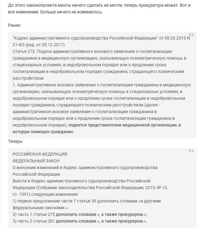 3 июля 2018 года Госдума приняла в третьем чтении закон, о принудительной госпитализации в психбольницу.