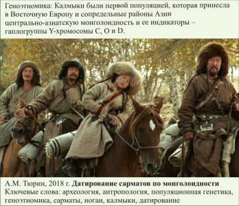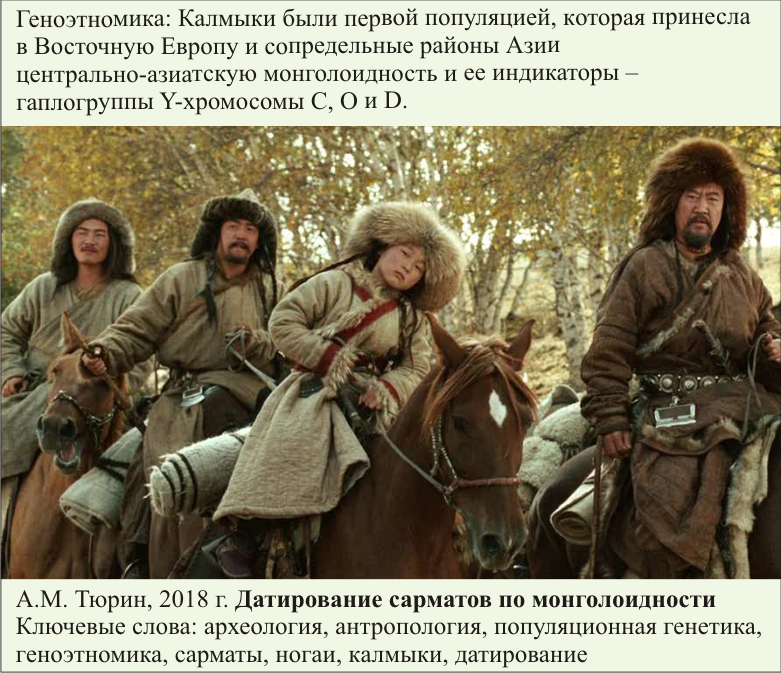 По результатам авторской интерпретации данных популяционной генетики [Тюрин, 2010; 2017-а; 2017-б; 2017-в] и антропологии [Тюрин, 2018-а] при учете достоверных археологических фактов [Матюшко, 2011] и исторических свидетельств [Трепавлов, 2016] сделан категорический вывод: калмыки были первой популяцией, которая принесла в Восточную Европу и сопредельные районы Азии центрально-азиатскую монголоидность и ее индикаторы – гаплогруппы Y-хромосомы C, O и D. Этим самым сформирован новый естественнонаучный метод изучения популяций – датирование по монголоидности. Краниологические серии с признаками монголоидности принадлежат ногаям, метисированным при контактах с калмыками. Их и могильники, по которым они сформированы, следует датировать периодом не ранее середины XVII в. (время прихода калмыков в обозначенный регион). По могильникам датируются археологические культуры. Датирование по монголоидности является составной частью новой дисциплины «Геноэтномика», в рамках которой реализуется мультидисциплинарный подход к изучению прошлого Человечества.