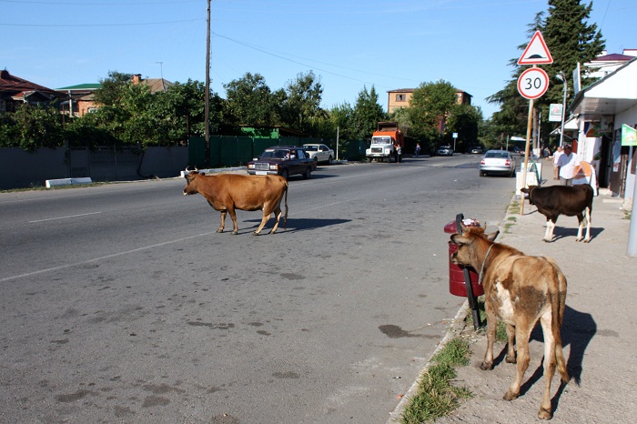 Ну да вернёмся к нашим коровам. В Лдзаа (Лидзава), где мы поселились, их довольно много. Щиплют травку вокруг островков кустарника, флегматично пережидают, остановившись на сплошной (!) , пока проедет машина, бредут по дорожкам мимо отелей. Так что поглядывайте под ноги.