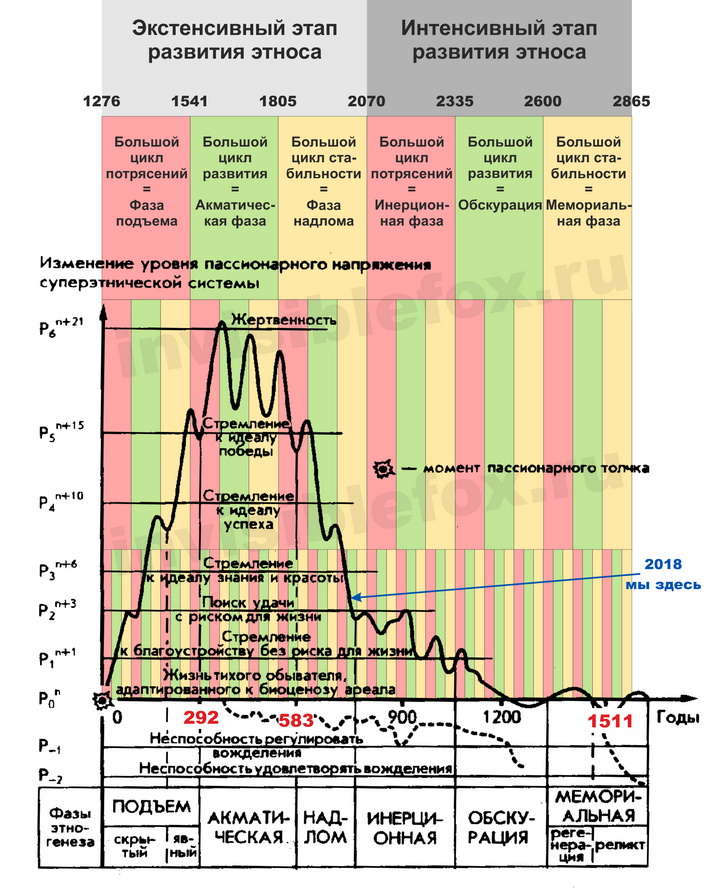 Поэтому любой этногенез состоит из двух половинок: экстенсивной – подъем, акматическая фаза и надлом, и интенсивной – инерционная фаза, обскурация, мемориальная фаза. Во время экстенсивной этнос растет количественно, поддерживая уровень пассионарности за счет притока новых членов. При интенсивной поступление пассионариев извне отсутствует, но этнос сохраняется за счет перераспределения накопленных людских ресурсов с периферии в столицу. Пусть даже и с потерей части территорий.