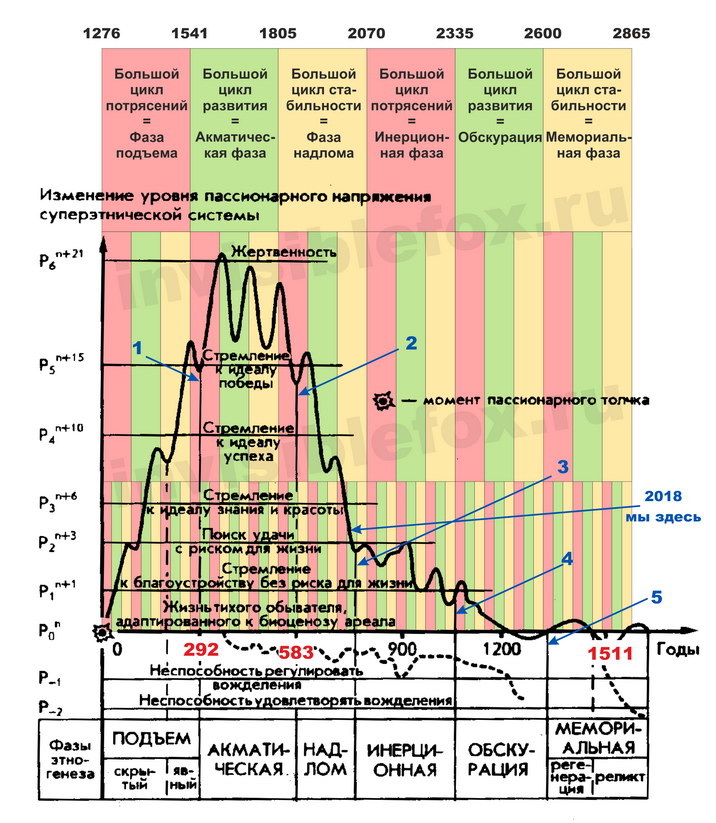 На этом фоне исключительно интересный вопрос, как теория циклов согласуется с теорией этногенеза Л.Н.Гумилева? Ведь на качественном уровне, пусть и другими словами, Лев Николаевич писал об очень схожих вещах. Разберем этот вопрос подробно, только предварительно исправим на кривой этногенеза небольшую техническую ошибку. Всем хорошо знакома эта картинка