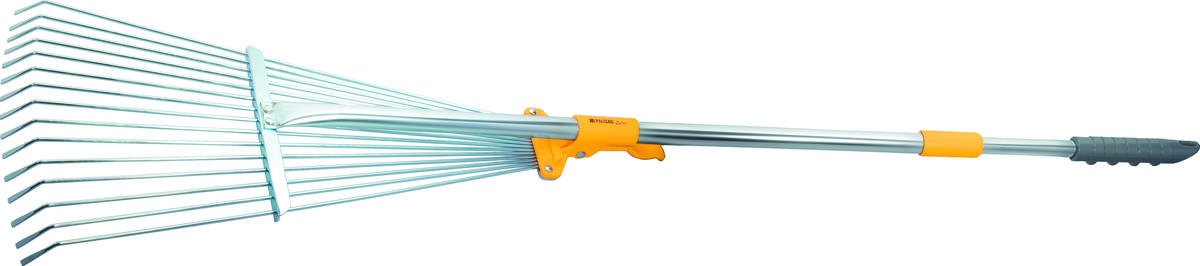 Обратите внимание на веерные грабли Palisad Luxe. Они имеют прочный алюминиевый телескопический черенок. С помощью скользящей по черенку втулки, которая фиксируется эксцентриковым зажимом в любом положении, ширина захвата легко меняется от 190 до 550 мм. Это позволяет добраться до сложных участков под кустами и между строениями.