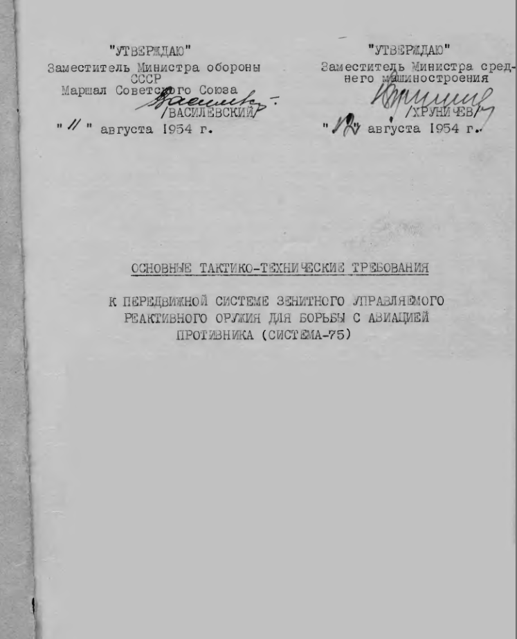 Разработка Системы -75 проводилась в соответствии с «Основными тактико-техническими требованиями к передвижной системе зенитного управляемого ракетного оружия для борьбы с авиацией противника (Система-75)» утвержденными маршалом Василевским 11 августа 1954 г.