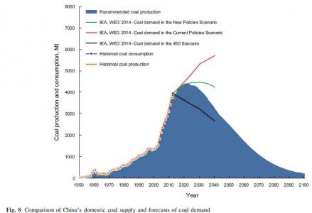 А вот как выглядит прогнозы добычи и использования угля в Китае по различным сценариям.Авторы считают,что оптимальным будет сценарий,если добыча будет плавно снижаться к 2100 году (на графике закрашено синим цветом).