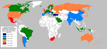 - Net pension replacement rates (чистый пенсионный коэффициент замещения) - чистая пенсионная выплата, деленная на чистую прибыль до выхода на пенсию, с учетом подоходного налога с населения и взносов на социальное страхование, выплачиваемых работниками и пенсионерами.