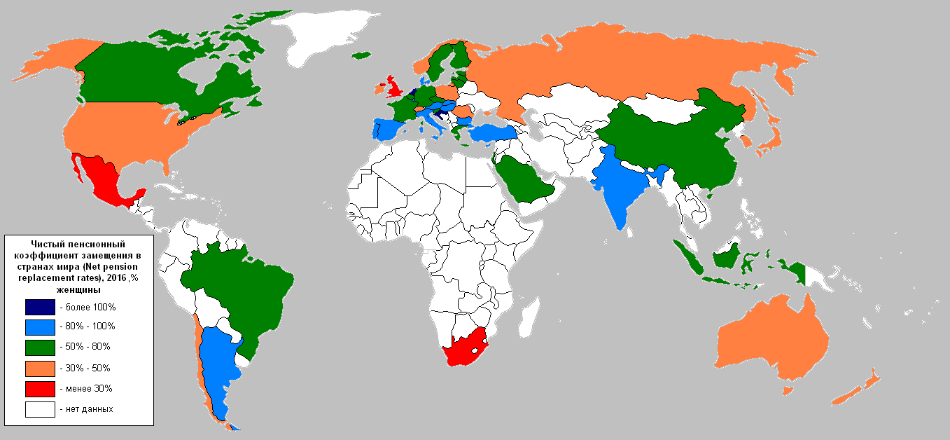 В 2014 году чистый пенсионный коэффициент замещения для женщин России оценивался ОЭСР в 73,7%. А Gross pension replacement rates – в 64,1%.