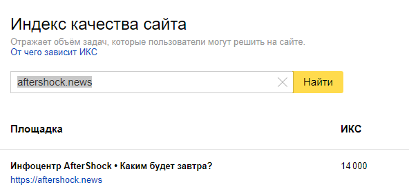 Яндекс запустил новый измеритель качества сайтов. Например, у моего сайта http://philosophystorm.org он равен 350. У Афторшока 14000 - это очень много. Например, у компьютертерры 2000.