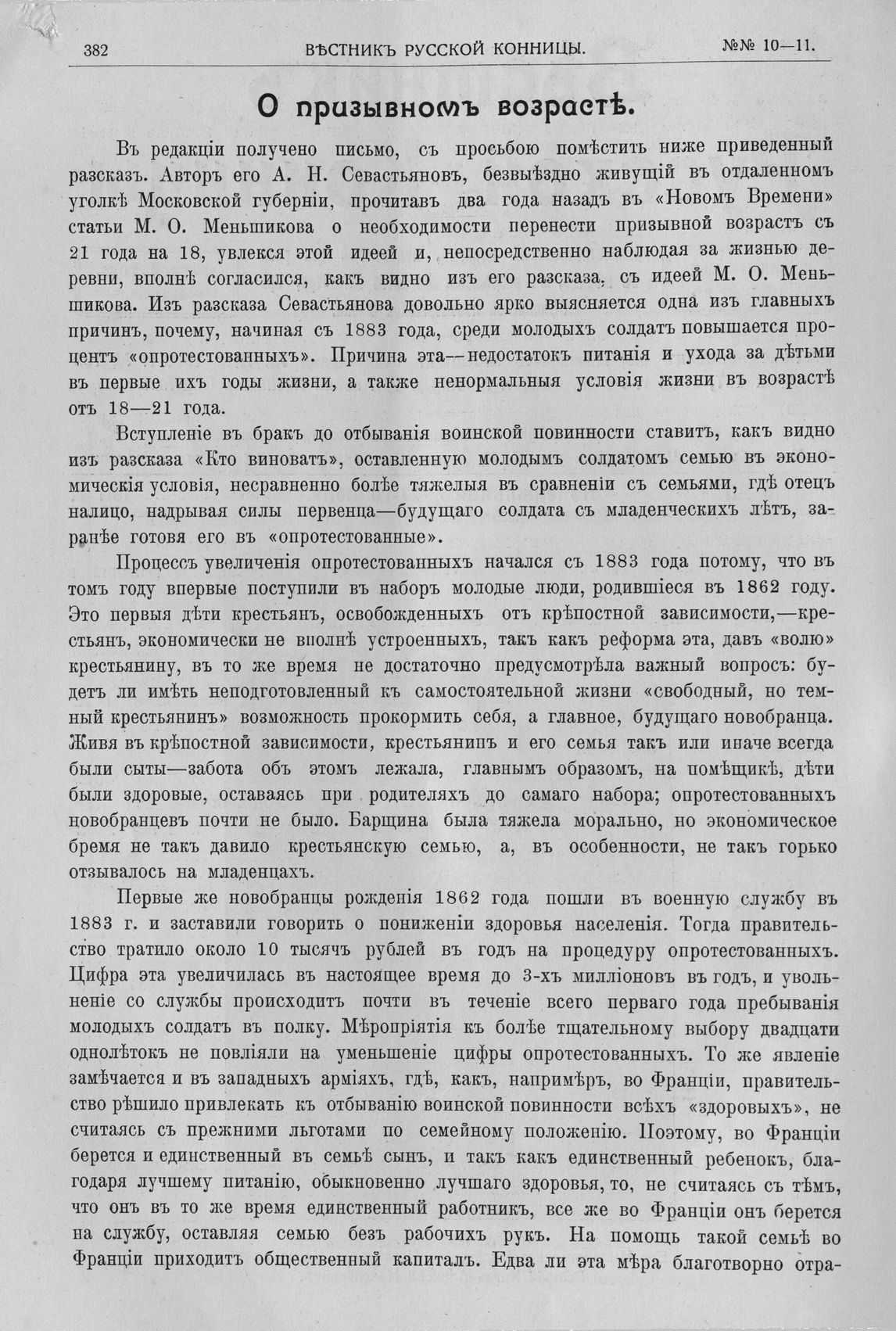 При этом сам М.О. Меньшиков ссылается на статью кн. Д. Багратиона «О призывном возрасте», опубликованную в № 11 «Вестника русской конницы» - это иллюстрированный двухнедельный журнал, издававшийся с 1906 по 1914 годы при Офицерской Кавалерийской школе Санкт-Петербурга. Но ссылки на страницу журнала и год его издания у М.О. Меньшикова отсутствуют