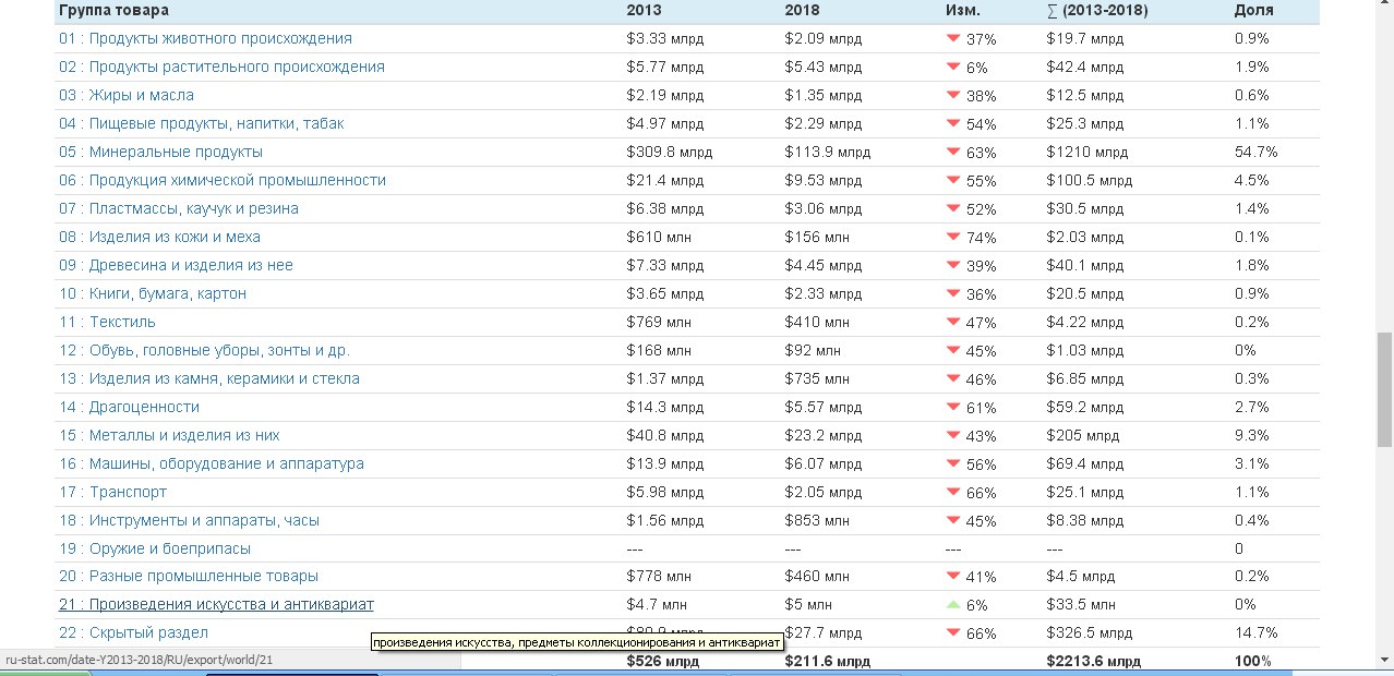 Экспорт из России за период 2013 - 2018 составил $2213.6 млрд. В основном экспортировались «Минеральные продукты» (55%), «Скрытый раздел» (15%). В структуре экспорта по странам на первом месте Нидерланды (12%), на втором месте Китай (9%).