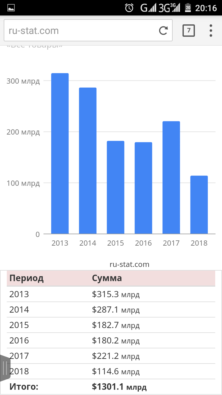 Импорт в Россию за период 2013 - 2018 составил $1301.1 млрд.