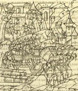 «Его Императорское Величество (Иван IV) и его двор на резвых малорослых испанских (надо понимать, ногайских или татарских бахматах) и турецких (аргамаках) лошадях, убранство которых было богато изукрашено золотом и серебром, прибыли на поле в добром порядке. На Его Императорском Величестве было богатое платье и алая шапка, унизанная не только жемчугом, но и большим количеством больших и дорогих драгоценных камней. Его дворяне, ехавшие перед ним по трое в ряд в добром порядке, были все в парчовом платье…».