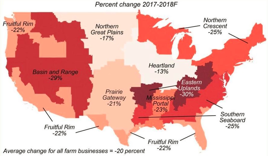 Каждый регион страны специализируется на своих специфических культурах. Наиболее пострадавших от торговых войн, регион занимается говядиной и пшеницей. Блейк Херст из Миссури, фермер выращивающий кукурузу и сою, сказал Yahoo Finance, что он уже видит падение спотовых цен на 15-20%. "Единственный ответ - добиться прогресса в переговорах с Китаем, поскольку они являются крупнейшими потребителями сои", - сказал он.
