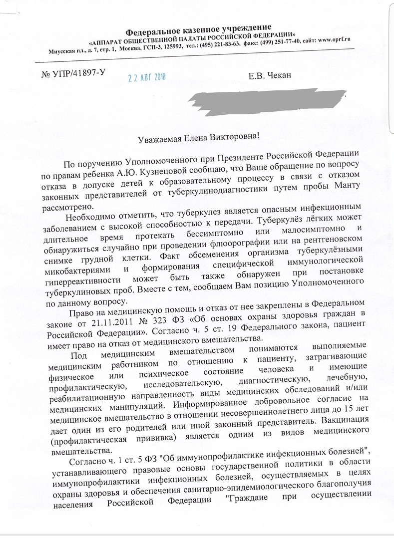 8) Позиция Генеральной прокуратуры, Верховного суда, Омбудсмена по правам детей при президенте РФ: отказ от противотуберкулёзной помощи не устанавливает ограничения прав на образование. Т.е. это не повод высаживать ребёнка из школы/детсада или переводить на домашнее обучение. Выбор формы обучения и образовательной организации - это право имеет только родитель (законный представитель).