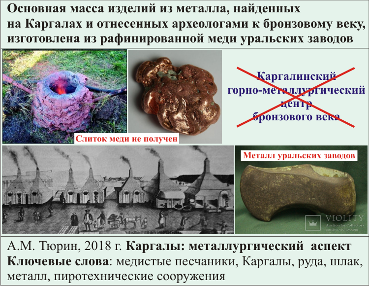 Выполнен химический и структурный анализ 36 образцов металла [Ровира, 2004, табл. 4.9]. Обсуждение полученных данных основано на двух ничем необоснованных гипотезах, введенных археологами по умолчанию. Для меди, произведенной в Каргалинском горно-металлургическом центре, характерно минимальное содержание примесей («Каргалы как ... наиболее вероятный источник руды, из которой выплавляли ... химически чистую медь» [Черных, 1997, с. 4]) и наличие в ней серы («Наличие медного сульфида (Cu2S) характерно для металла с Горного» [Ровира, 2004, с. 122]). Но это именно характеристики меди уральских заводов XVIII-XIX вв. Там производили рафинированную медь. А ее получение через медный штейн обеспечивает наличие в металле серы. Поэтому заключение С. Ровиры по одному из образцов – «Состав металла (Cu – 99,8, Fe – 0,1, S – 0,1 %) абсолютно типичен для местной меди» [2004, с.132], вполне корректное. Это действительно местная рафинированная медь, произведенная на уральских заводах. Но вернемся к необоснованным гипотезам. Автор монографии [Григорьев, 2013] проблему сформулировал так. «Без каких-либо аналитических доводов, предлагающих химические способы различения меди разных месторождений, любая нелегированная медь объявляется каргалинской» (с. 358). Причем, не просто каргалинской, а относящейся к бронзовому веку.