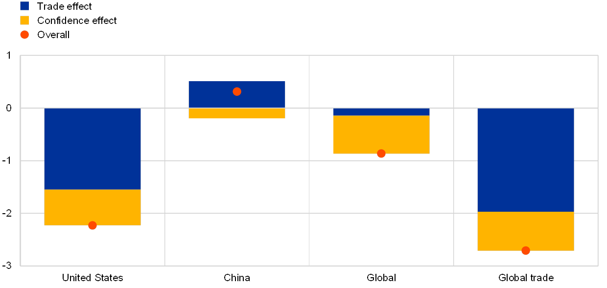 Волнуется и ЕС.Недавно эксперты Европейского Центробанка провели исследование, как повлияет китайско-американский конфликт на мировую торговлю.Изучалось два основных фактора:изменение торговых потоков в условиях глобализации и неопределенность в экономиках,ввиду изменения этих потоков.Ведь сейчас многие бизнесмены думают,где развивать производства,а где их закрывать,какие это производства.Пока думают,развитие приостановилось,что, естественно, повлияет на экономические результаты.И вот к каким выводам пришли эксперты:изменение товарных потоков в первый год торговой войны сократит ВВП США на 1,5%, а ВВП Китая увеличит на на 0,5%.В целом,с учетом фактора неопределенности, ВВП США сократится,а ВВП Китая увеличится.Мировой ВВП сократится менее чем на 1%,а мировая торговля менее чем на 3%.