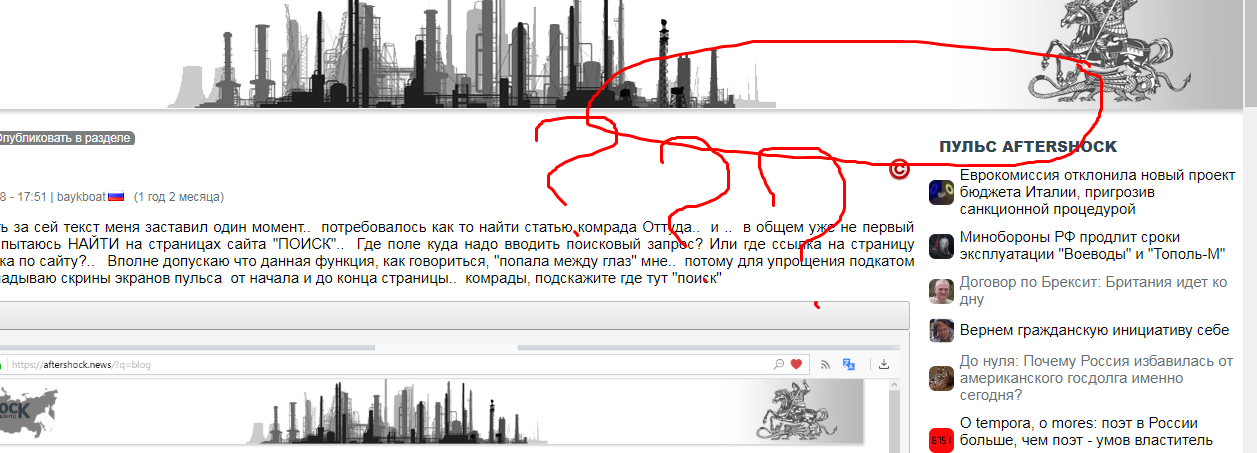 Сесть за сей текст меня заставил один момент.. потребовалось как то найти статью комрада Оттуда.. и .. в общем уже не первый раз, пытаюсь НАЙТИ на страницах сайта "ПОИСК".. Где поле куда надо вводить поисковый запрос? Или где ссылка на страницу поиска по сайту?.. Вполне допускаю что данная функция, как говориться, "попала между глаз" мне.. потому для упрощения подкатом выкладываю скрины экранов пульса от начала и до конца страницы.. комрады, подскажите где тут "поиск"