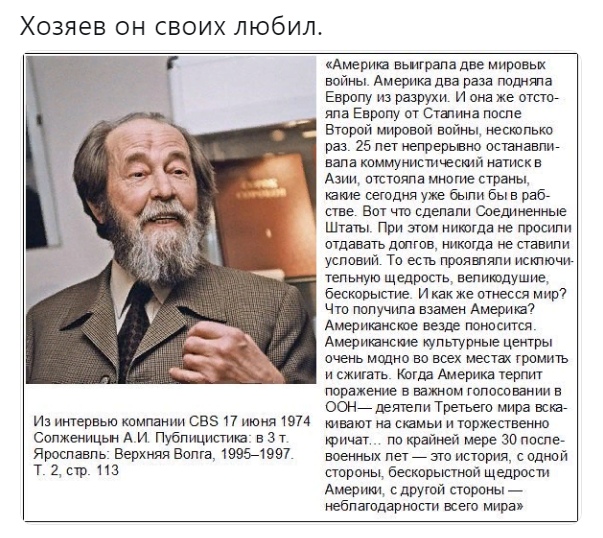 А вот здесь самая главная, самая дрянная и пораженческая суть солженизма — "Надо перестать попугайски повторять: "мы гордимся, что мы русские", "мы гордимся своей необъятной родиной", "мы гордимся…". Надо понять, что после всего того, чем мы заслуженно гордились, наш народ отдался духовной катастрофе Семнадцатого года (шире: 1915—1932), и с тех пор мы — до жалкости не прежние, и уже нельзя в наших планах на будущее заноситься: как бы восстановить государственную мощь и внешнее величие прежней России".