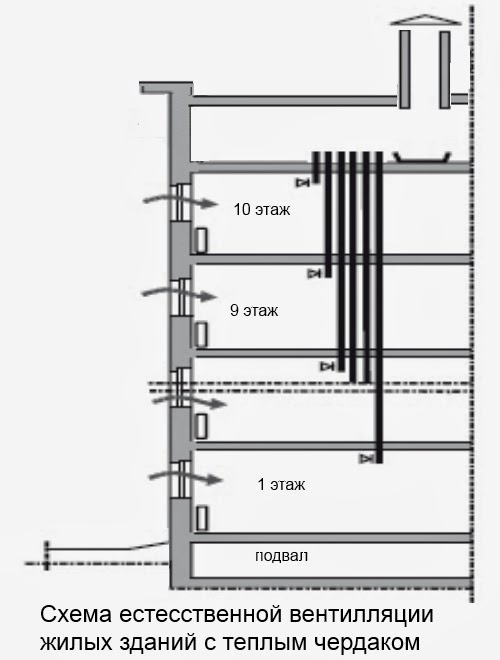 Схема вытяжек судя по фото, не удалось ознакомится с чертежами вентсистем данного здания - с тёплым чердаком, что при наличии газовых плит недопустимо с моей точки зрения, но теплее с точки зрения авторов типового проекта: