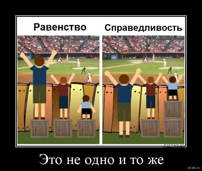 2. Если вы хотите той справедливости что на картинке то это противоречит самой нашей природе и законам вселенной. Мы живем в мире где постоянно идет естественный отбор сильнейших, они и получают больше ресурсов. Если ресурсы делить поровну то такое общество будет деградировать, если по справедливости ("отстающим" больше ресурсов) будет деградировать еще быстрее. У всех пропадет мотивация.