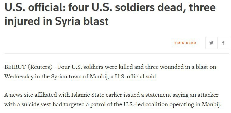 Власти США подтвердили гибель четырех американских военнослужащих в результате взрыва в городе Манбидж. Об этом сообщило в среду агентство Reuters со ссылкой на официальный американский источник, еще трое американских военных были ранены в результате взрыва в Манбидже, отметил американский официальный представитель.