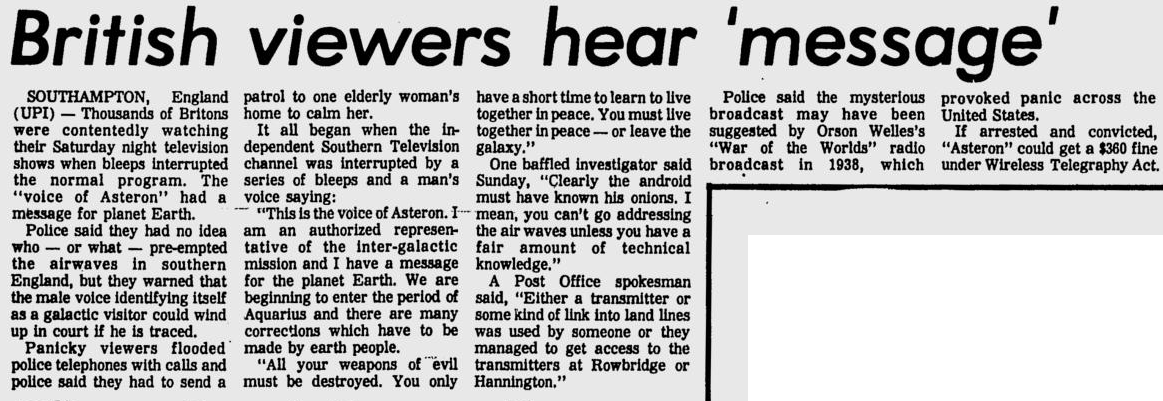 Он имел место 26 ноября 1977 года в южной Англии, и известен под названием Southern Television broadcast interruption. Базовое описание присутствует в английской википедии [1] (тот еще источник, но в данном случае важно то, что он содержит ссылки на проверяемые сообщения в прессе). Более подробно инцидент описан например в статье Даниэля Тарра [2], содержит прямые ссылки на архивы газет того времени, часть из которых непосредственно доступна. Инцидент считается первым случаем перехвата телевизионного вещания. Сообщение, доставленное путем перехвата, считается розыгрышом, однако личность взломщика не была установлена.