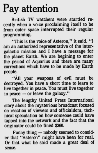 Трансляция стала сноской в уфологии, поскольку некоторые решили принять предполагаемую «инопланетную» трансляцию за чистую монету, ставя под сомнение объяснение перехвата передатчика. В течение двух дней после сообщения об инциденте в «Таймс» в письме в редакцию, опубликованном 30 ноября 1977 года, спрашивалось: «Как IBA или кто-либо другой может быть уверен, что трансляция была ложной?» [W11]. Редакция одной из американских местных газет — Eugene Register-Guard — прокомментировала: «Похоже, никто не считал, что Астерон мог быть настоящим» [W12]. Уже в 1985 году эта история вошла в городской фольклор, и было высказано предположение, что у трансляции не было никакого объяснения [W13].