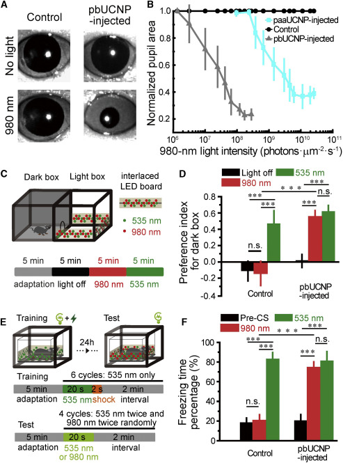 Что касается практического применения UCNPs, желательны более высокая визуальная чувствительность и разрешение. Мы модифицировали UCNPs и создали фоторецепторные наночастицы, чтобы увеличить близость между наночастицами и фоторецепторами. Таким образом, чувствительность к свету NIR относительно генерации светоиндуцированного поведения была улучшена на два порядка. Поэтому, теперь возможно использовать biocompatible малоэнергичное Сид Nir для того чтобы выпытать визуально поведение в животных, довольно Чем более инвазионные высокомощные лазеры NIR (инфракрасный)неизбежно используемые в обычных применениях ucnp биомедицинских (Chen et al., 2018,He et al., 2015). В эксперименте Y-образного водного лабиринта мы подсчитали, что 980-Нм светодиодный свет был преобразован в 535-Нм светом pbUCNPs при интенсивности 293 фотонов × μm -2× s -1 на сетчатке. Родовой и конусно-опосредованный пороги визуального поведения мышей-0,012 и 200 фотонов × мкм -2 × С -1 на роговице, соответственно (Sampath et al., 2005), равная 0,003 и 50 фотонов × мкм -2 × С -1 на сетчатке (Do et al., 2009). Таким образом, в нашей системе 293 фотона × μm -2 × s -1 на сетчатке было достаточно, чтобы активировать как стержневые, так и конусные фоторецепторы, и на практике эта визуальная система NIR смогла обнаружить свет NIR, который был на несколько величин ниже интенсивности, чем в настоящее время. По сравнению с стержнями, конусы кодируют несколько порядков более высокой интенсивности света и являются более важными для зрения человека высокой остроты зрения. Таким образом, pbucnp-связанные конусы могут посредничать High-resolution зрение картины изображения NIR. Ретины также обладают собственными фоточувствительными ганглионными клетками сетчатки (ipRGCs), которые опосредуют неидеообразующие зрительные функции, такие как фотоентраинмент циркадного ритма (Do and Yau, 2010). Под интенсивностью, используемой в нашем поведенческом эксперименте, NIR light не активировал ipRGCs (рисунок S5 F), что, вероятно, было связано с большим расстоянием ipRGCs до pbUCNPs и их низкой чувствительностью (Do et al., 2009). Что касается пространственного разрешения изображения NIR, мыши, вводимые pbUCNP, имели хороший зрение глаза NIR (0,14 ± 0,06 циклов/степень, половина разрешения видимого изображения), что позволяет им видеть сложные модели света NIR (инфракрасный).