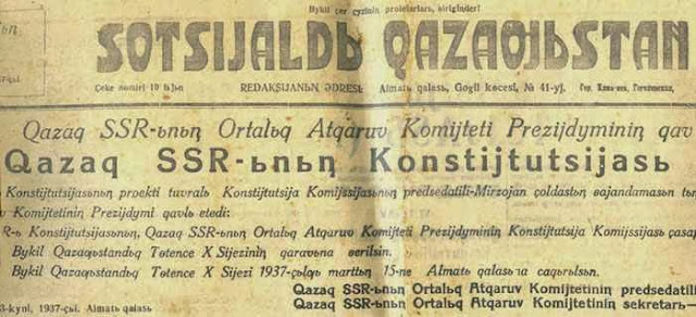Первая полоса республиканской газеты Казахской ССР на казахском языке "Социалистик Казахстан", издаваемой во время кампании латинизации в СССР. 1937 год.