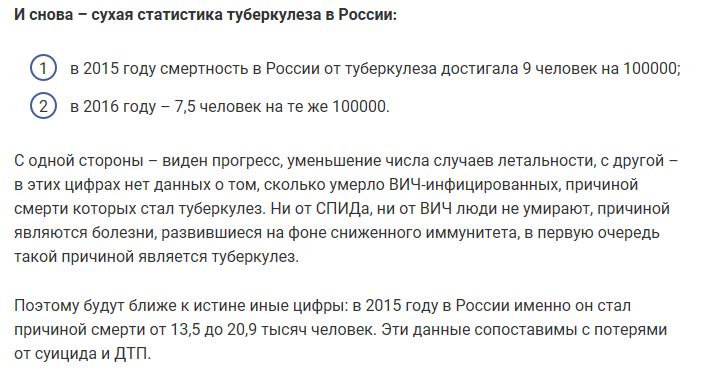 В России мы по факту живём в условиях эпидемии этой жуткой болезни: по медицинским данным от 70 до 99% (!!!) населения являются носителями возбудителя туберкулёза.