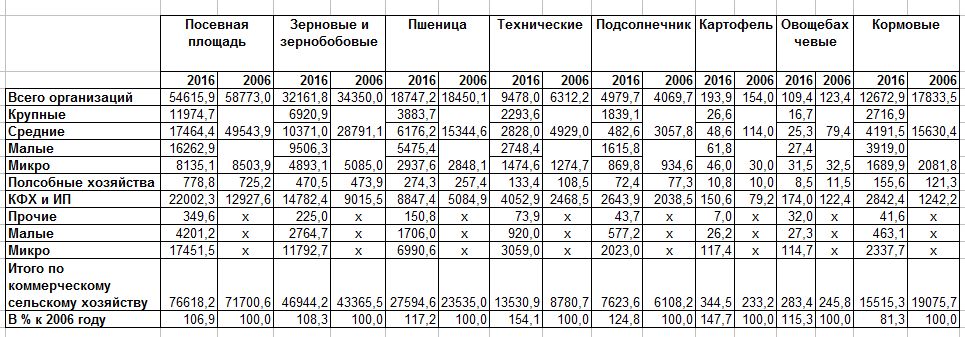 Комментарий к таблицам: Все данные относятся исключительно к субъектам, осуществлявшим сельскохозяйственную деятельность в 2006 и 2016 годам соответственно. Мёртвые души и "сельхозпредприятия" исключительно по названию не учитываются. Поскольку в 2006 не делалось разбивки предприятий на крупные и средние, на мелкие и микропредприятия - они в столбцах за 2006 год даны суммарно. КФХ и ИП в 2006 году не разделялись по количеству работников.