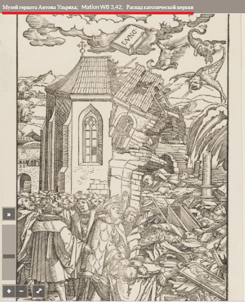 А вот еще одна гравюра, как некий боевой листок, агитка протестантов, на которой Евангелие разрушает половину Здания (в широком смысле) католической церкви. Что собственно и произошло по итогам Реформации и Тридцатилетней войны: протестантские монархии оттяпали у РКЦ половину Западной Европы: