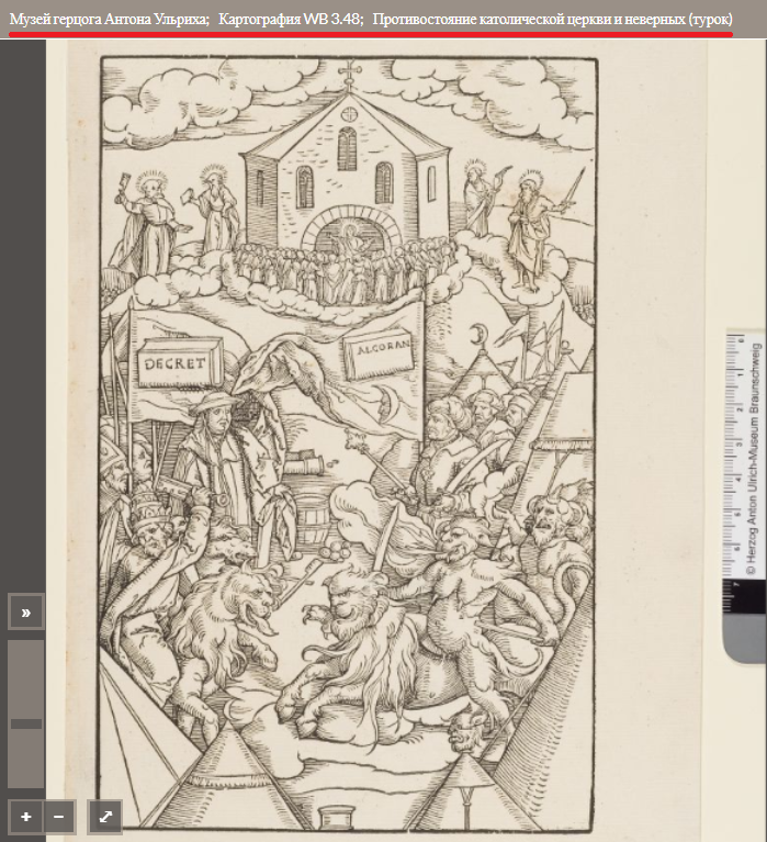 – На ней мы видим противостояние папского престола с турками, у которых главная книга называется Коран (ALCORAN). А вот у католиков главная книга называется DECRET. Что вы думаете по этому поводу?