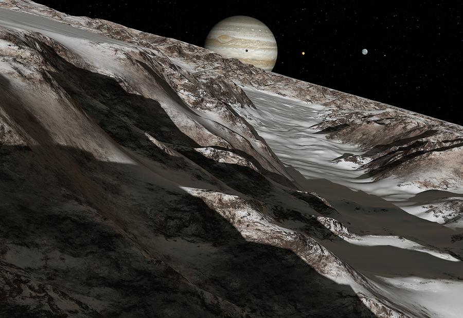 Тени, солнце и звезды находятся в плавном величественном движении, незаметном, впрочем, в текущем моменте. Ганимед с огромной скоростью идёт по орбите вокруг Юпитера, оставляя его практически неподвижным относительно точки наблюдения на своей поверхности.
