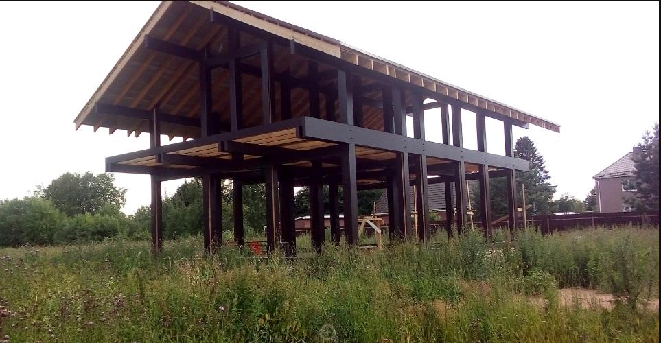 А ниже мои фотки- Фундамент настолько мощен, что поражает воображение. А несущие конструкции сделаны на века! Правда почему-то из палок. Не. Я не ошибся. Это не стволы лиственницы, а клеенный брус. Палки склеенные... Сами знаете чем. Сто лет простоят! Если го клея хватит.