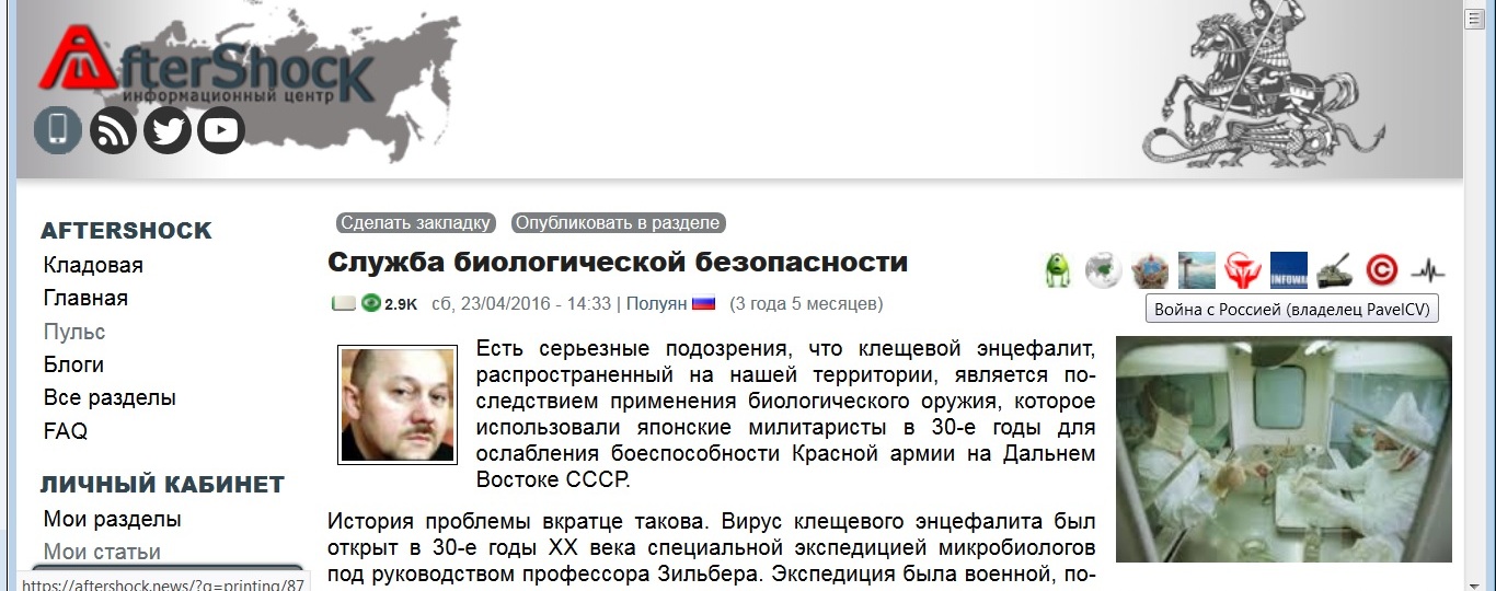 Ну, хоть американцы сами проблему приподняли, а, значит, не обвинят "русских хакеров" в провоцировании скандала.)) Хотя, всё может быть... Был случай в 1997 году: я беседовал на эту тему с американкой - экологиней, представительницей некоего некоммерческого фонда, которая боролась за здоровье лесов у нас в Красноярском крае. Говорю: "Вы знаете, что энцефалитный клещ - биологическое оружие?" Она меня решила срезать, отвечает: "Хотите сказать, его ЦРУ придумало?" А я в ответ: "Нет! Это японское изобретение!" (Интервью с американкой я опубликовал тогда же на страницах красноярской "Сегодняшней газеты".)