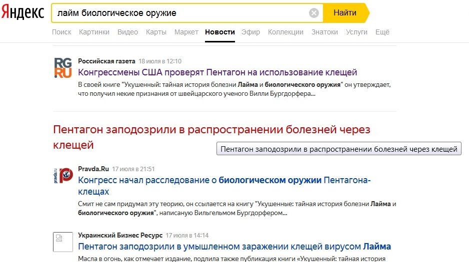 "Конгресс США проголосовал за начало расследования в отношении экспериментов Пентагона с клещами, переносящими боррелиоз (болезнь Лайма), для их использования в качестве биологического оружия. Об этом пишет Guardian. Некоторые политики в Палате представителей США серьезно убеждены в том, что Пентагон с 1950 по 1975 годы выпустил "на волю" клещей, впервые зараженных болезнью Лайма. Согласно петиции республиканца Кристофера Смита, министерство обороны могло тестировать клещей и других насекомых в качестве биологического оружия.