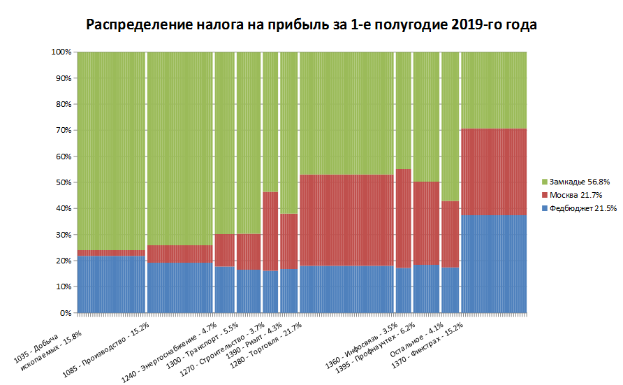 Вышла статистика от ФНС за 1-е полугодие. Увы, но тренд последних лет, направленный на снижение доли города Москвы в налоге на прибыль оказался сломан. Из ожидавшегося мною курса на 17% (с учётом доли федбюджета в налоге на прибыль), Москва отхватила в этом полугодии 21,7% (за весь 2018-й год - 19,1%).