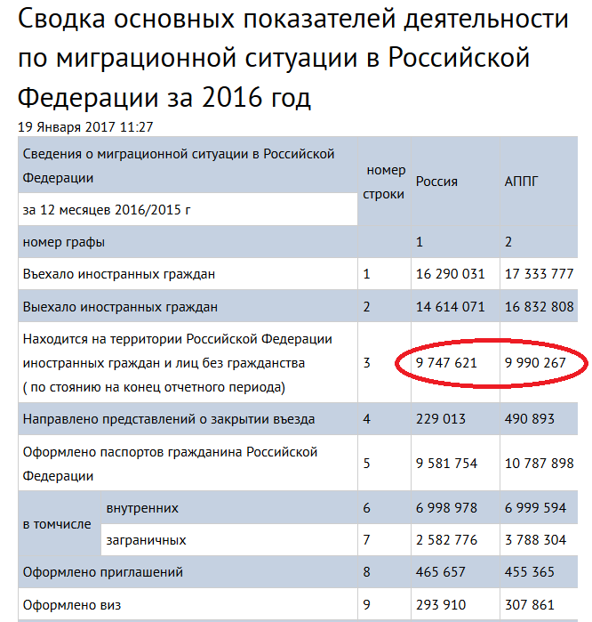 Итак, мы получили цифру населения России за 2016г. в 131,4 млн. чел. Но, в стране присутствуют ещё миллионы мигрантов которые тоже едят хлеб и численность которых нужно отминусовать от получившейся цифры. Так сколько же у нас в стране мигрантов? Берём официальные данные МВД: